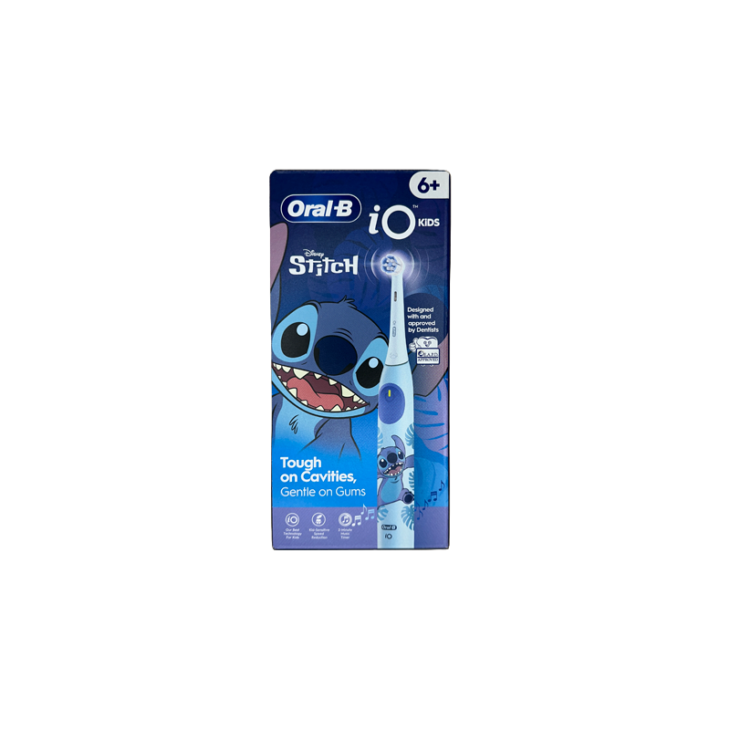 Cepillo eléctrico infantil +6 años con diseño Stitch. Tecnología iO con 3 modos de cepillado, cabezal extra‑suave, temporizador 2 minutos y batería recargable. Incluye 1 cabezal. No incluye estuche de viaje ni porta‑recambios.